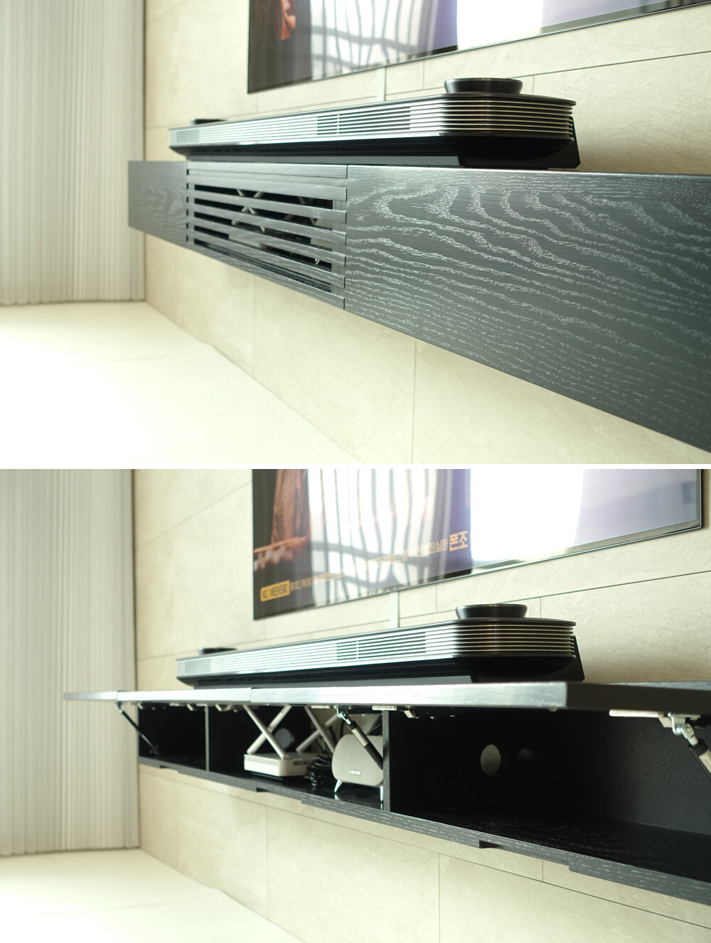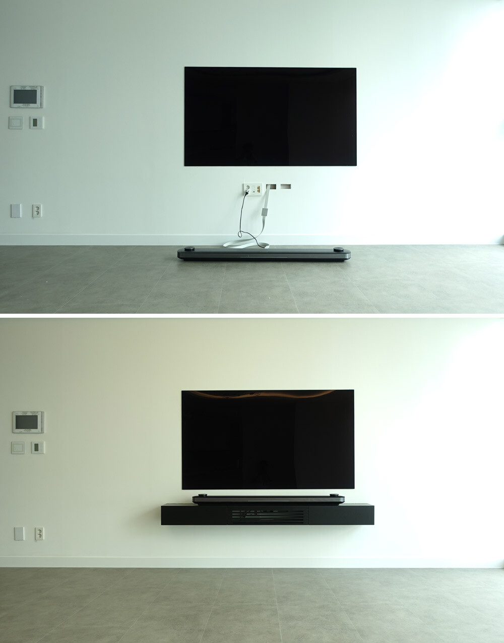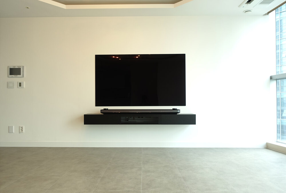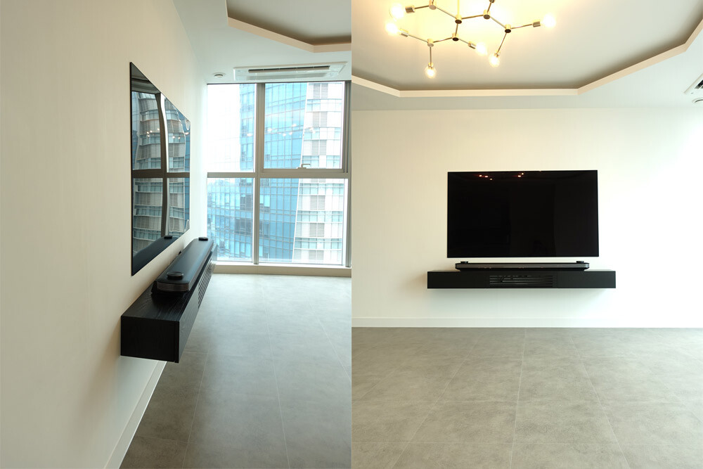거실과 안방의 벽걸이TV 아래에 설치할 수 있는 무지주 형태의 거실장(선반장)입니다.