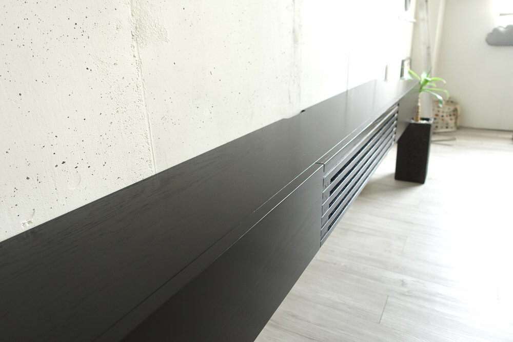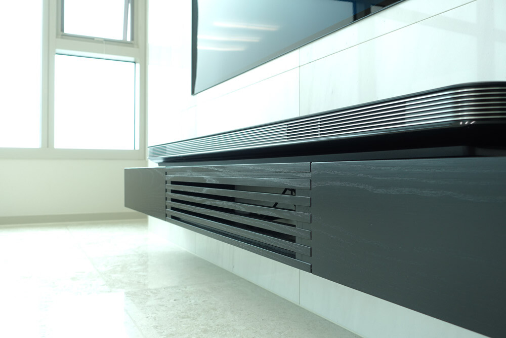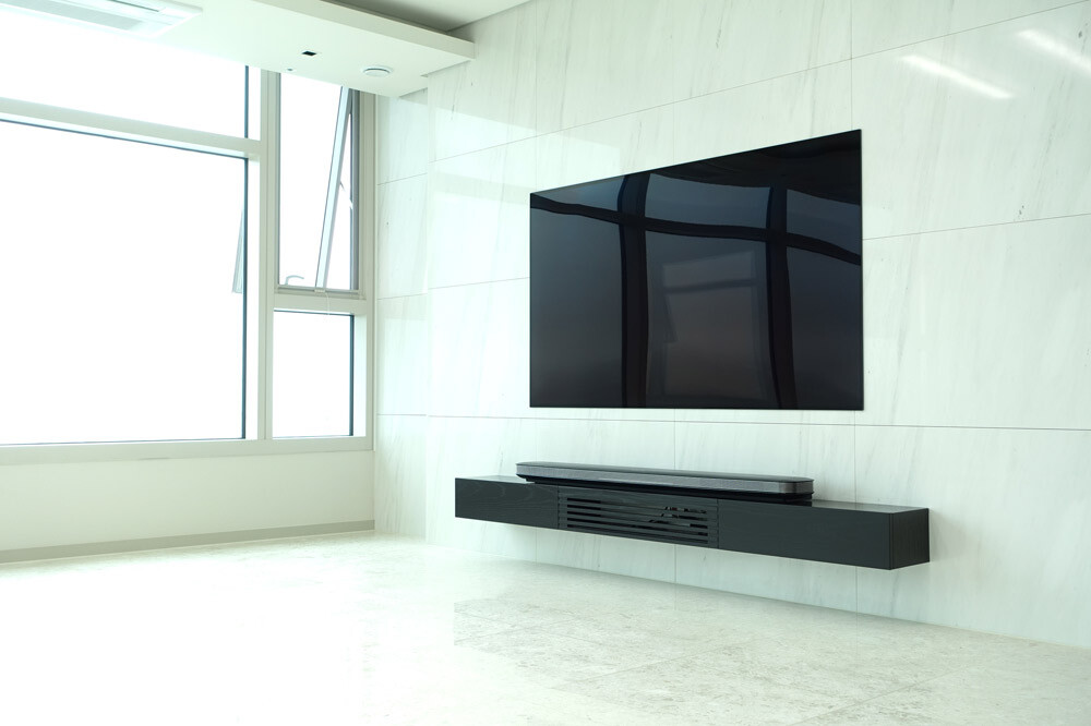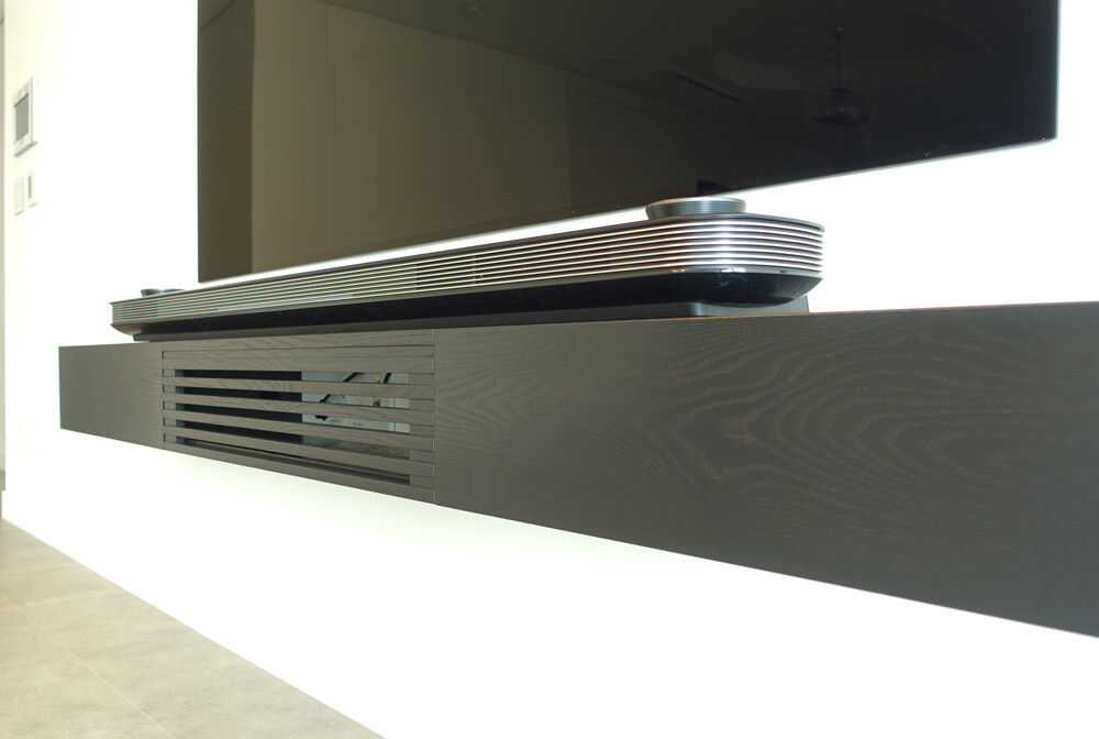 거실과 안방의 벽걸이TV 아래에 설치할 수 있는 무지주 형태의 거실장(선반장)입니다.