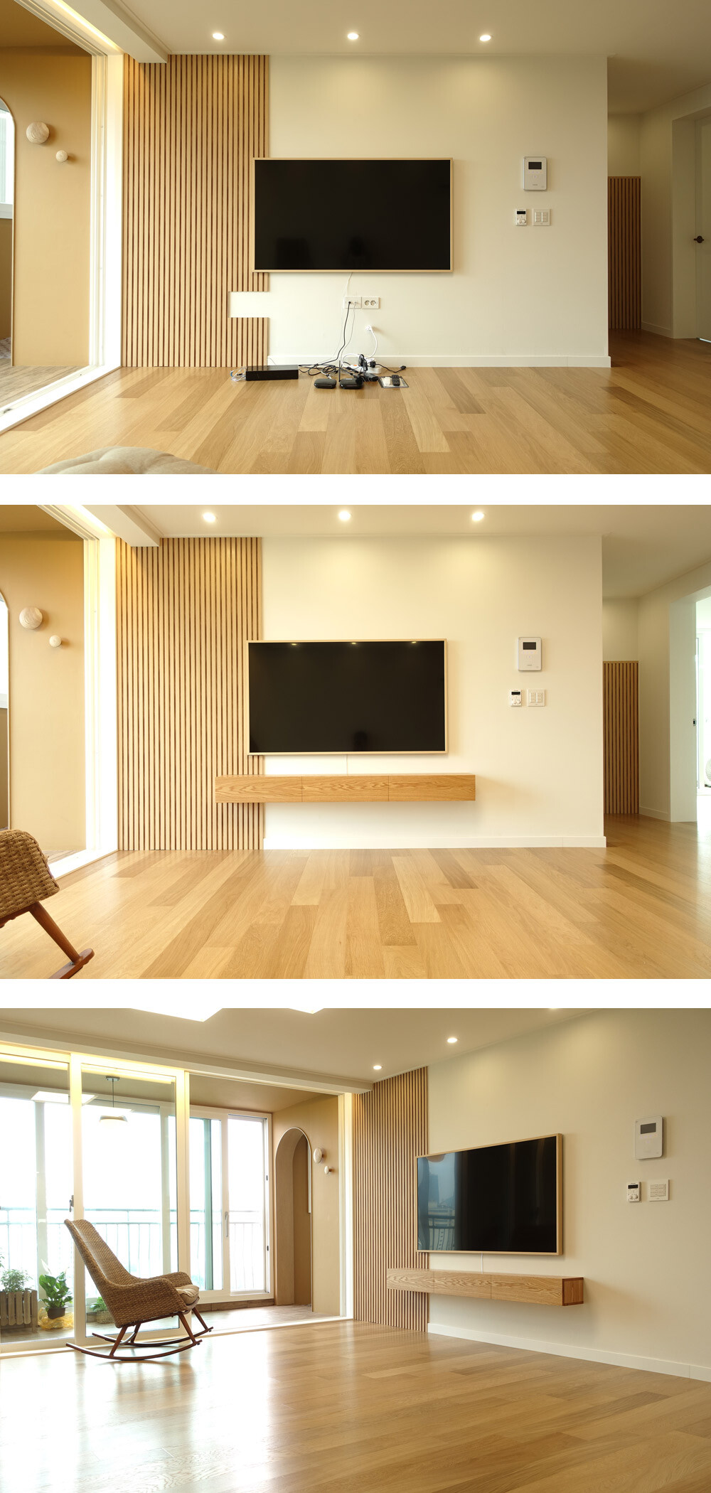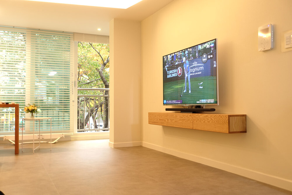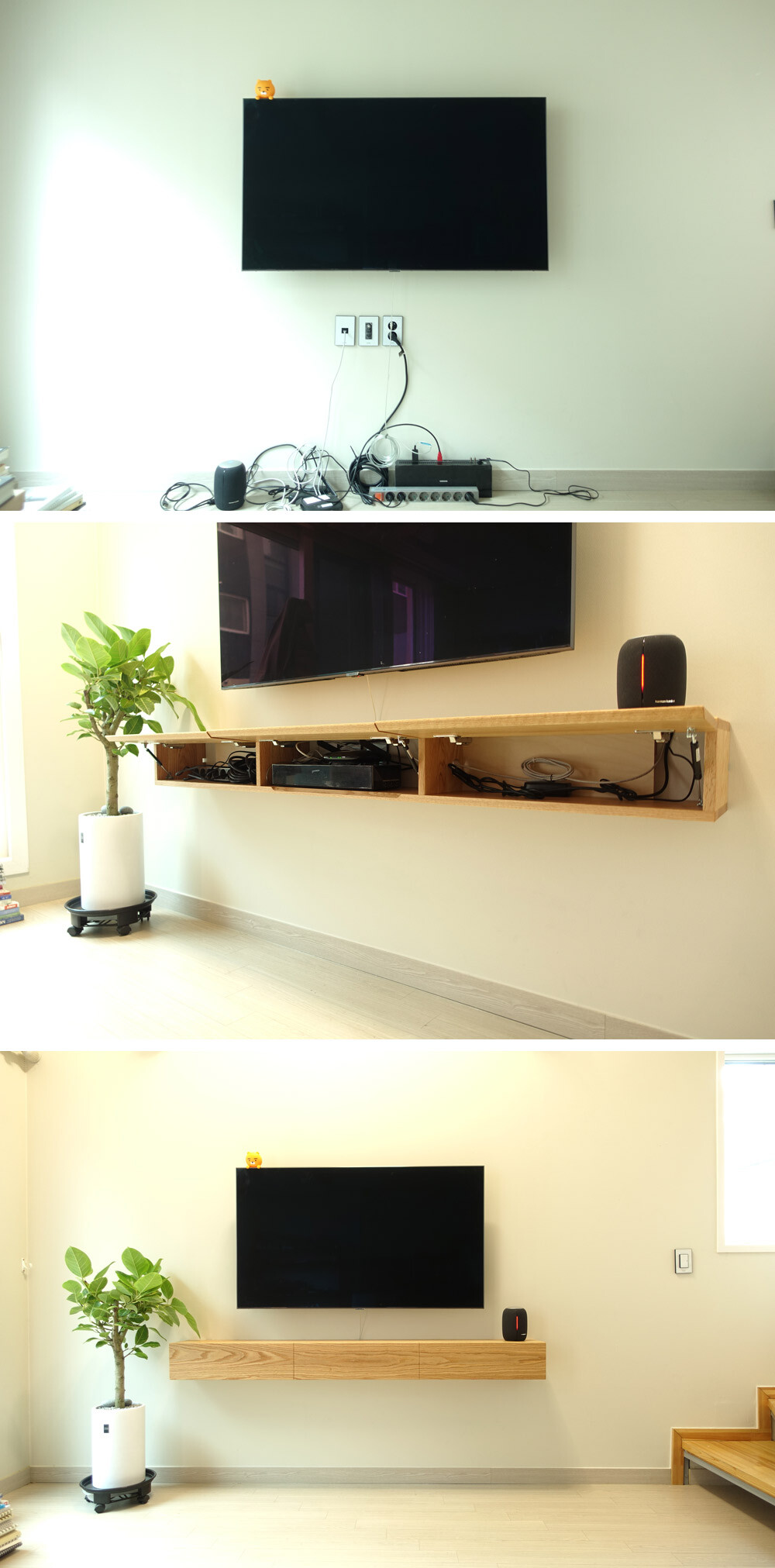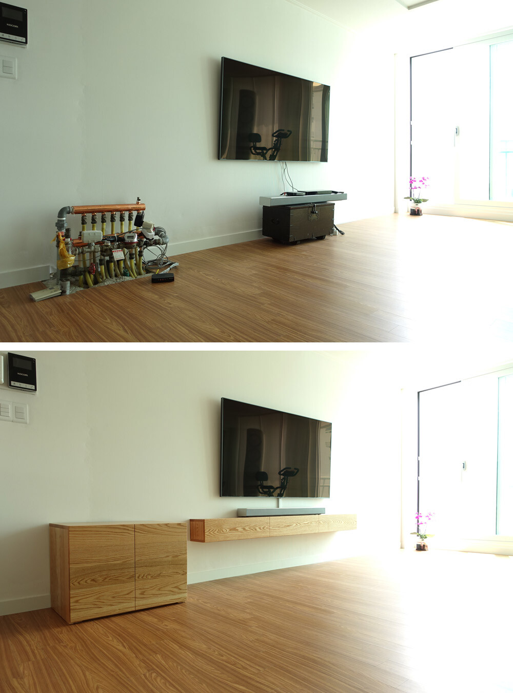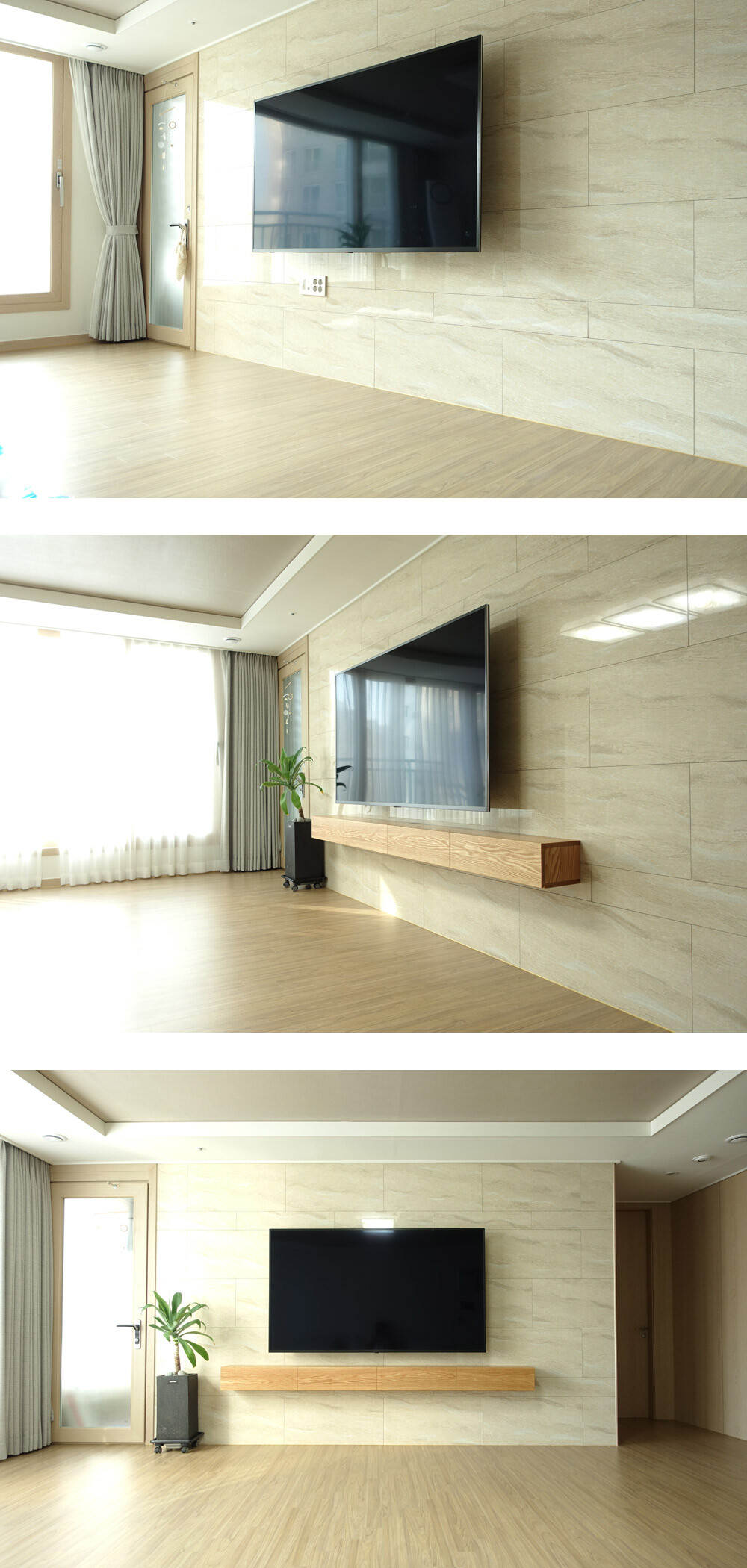 거실과 안방의 벽걸이TV 아래에 설치할 수 있는 무지주 형태의 거실장(선반장)입니다.