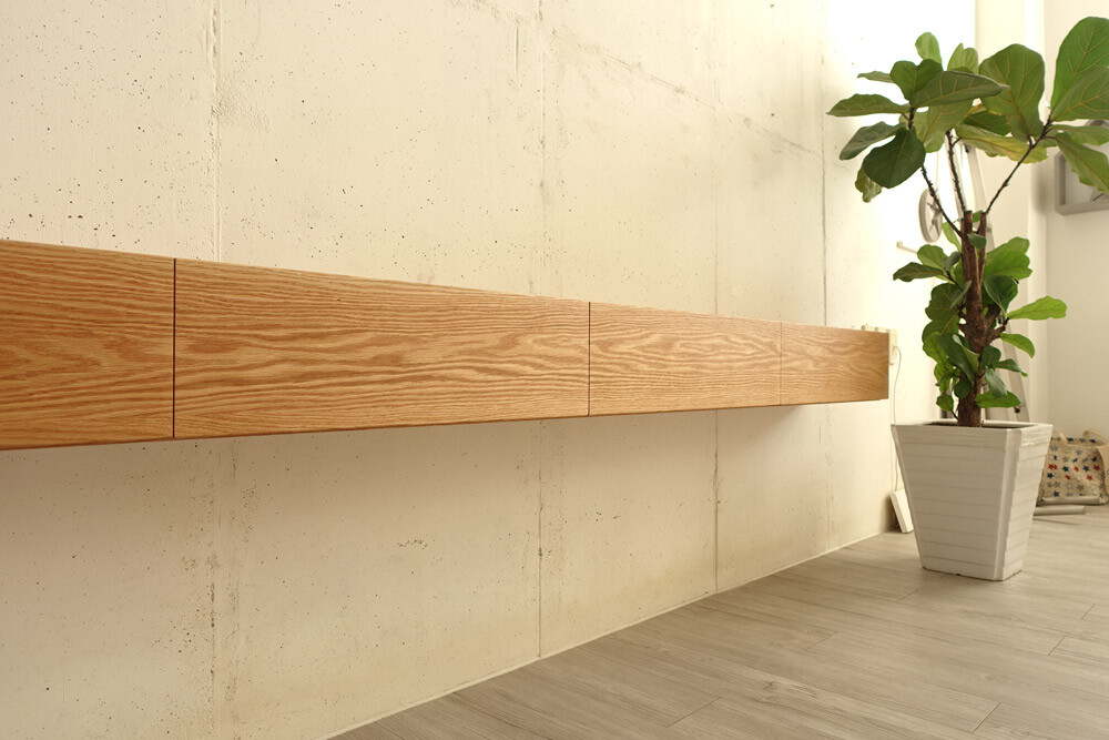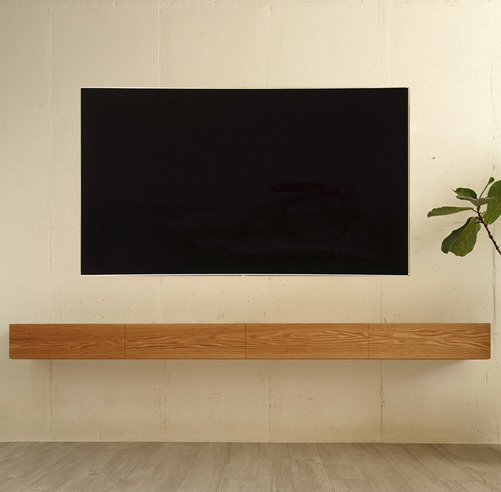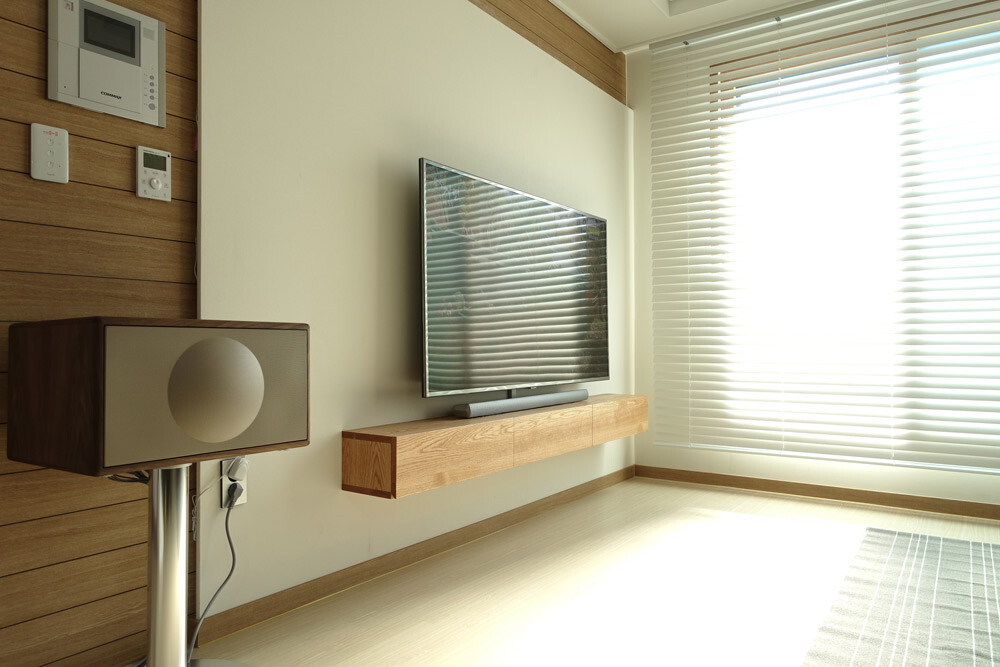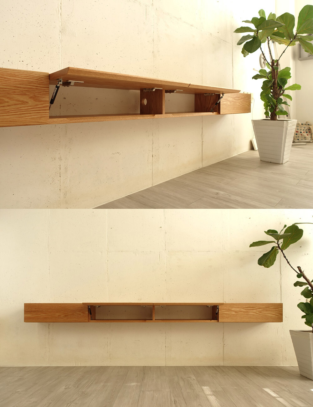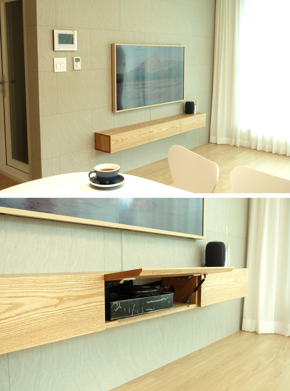거실과 안방의 벽걸이TV 아래에 설치할 수 있는 무지주 형태의 거실장(선반장)입니다.