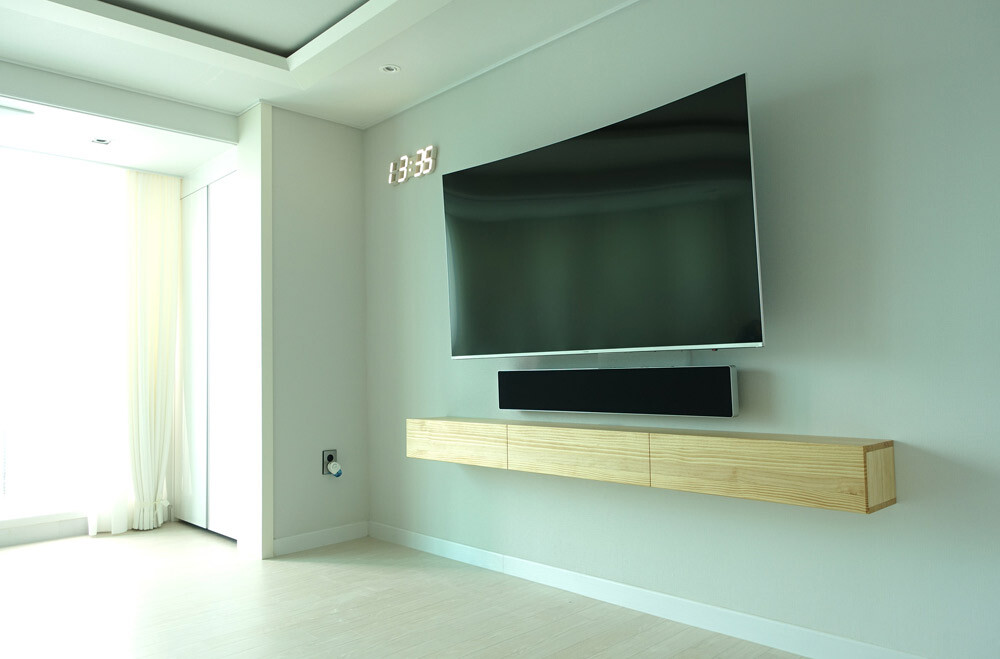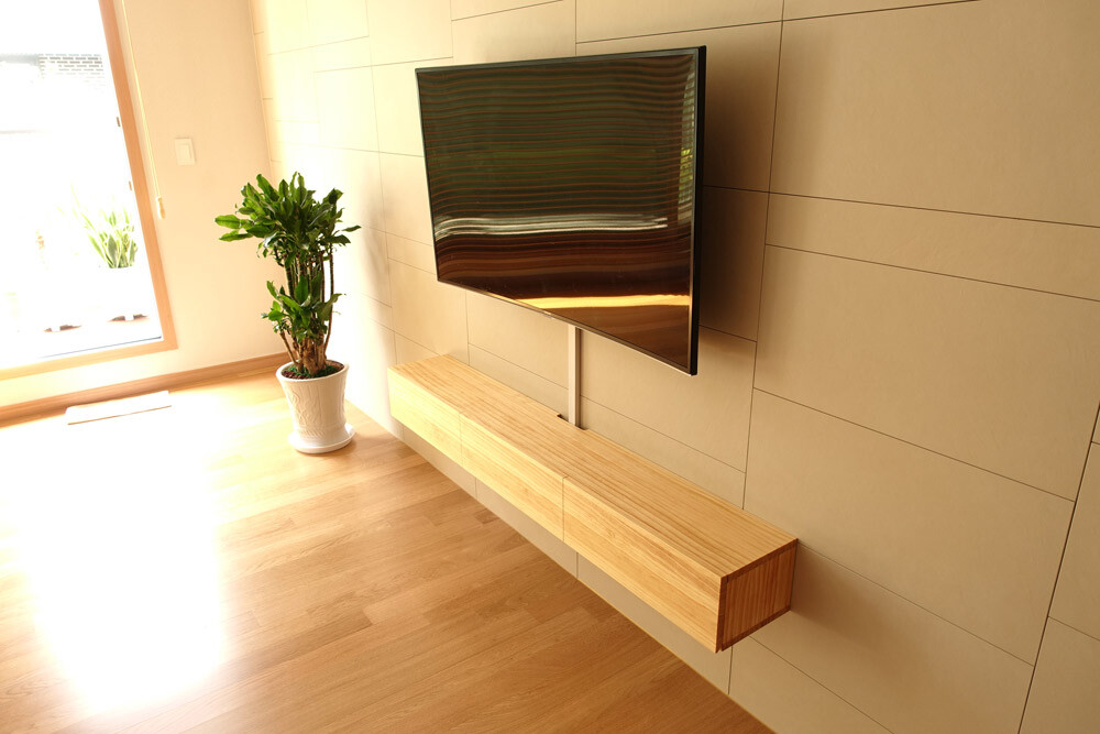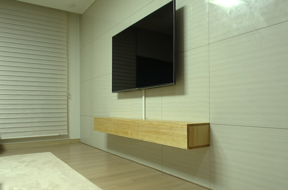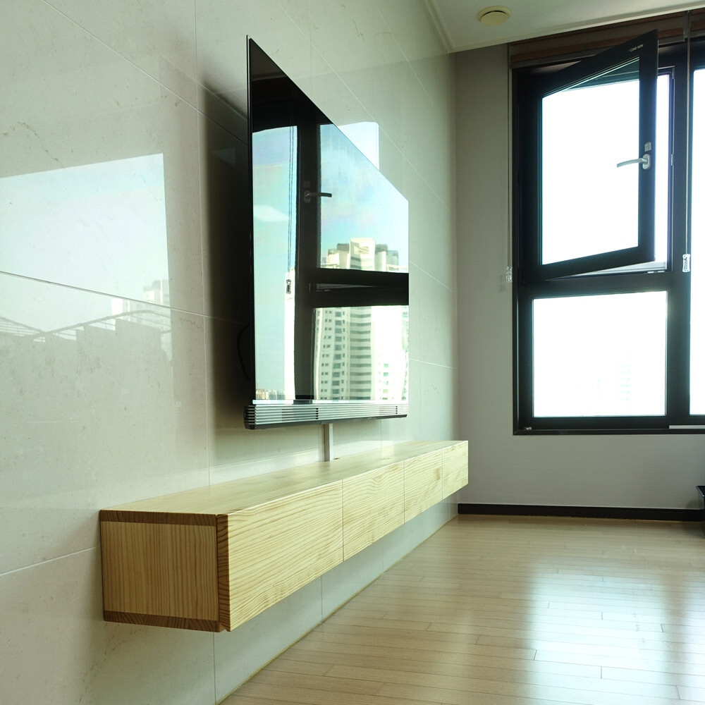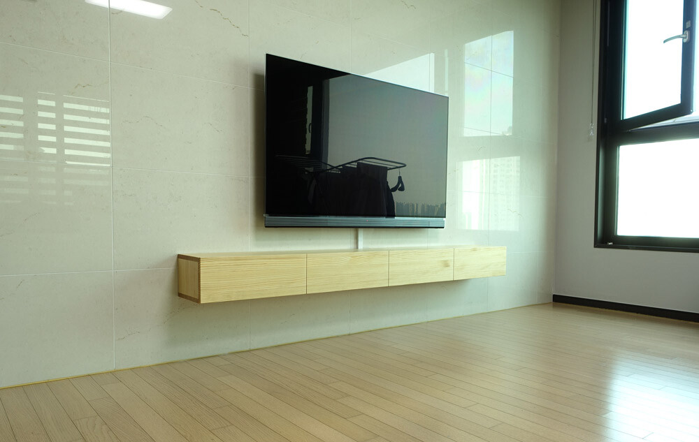 거실과 안방의 벽걸이TV 아래에 설치할 수 있는 무지주 형태의 거실장(선반장)입니다.