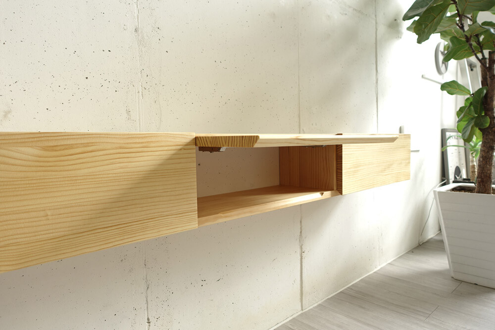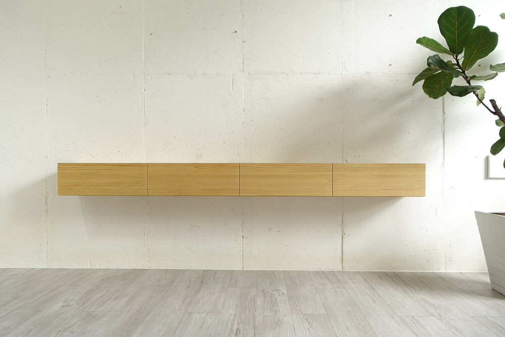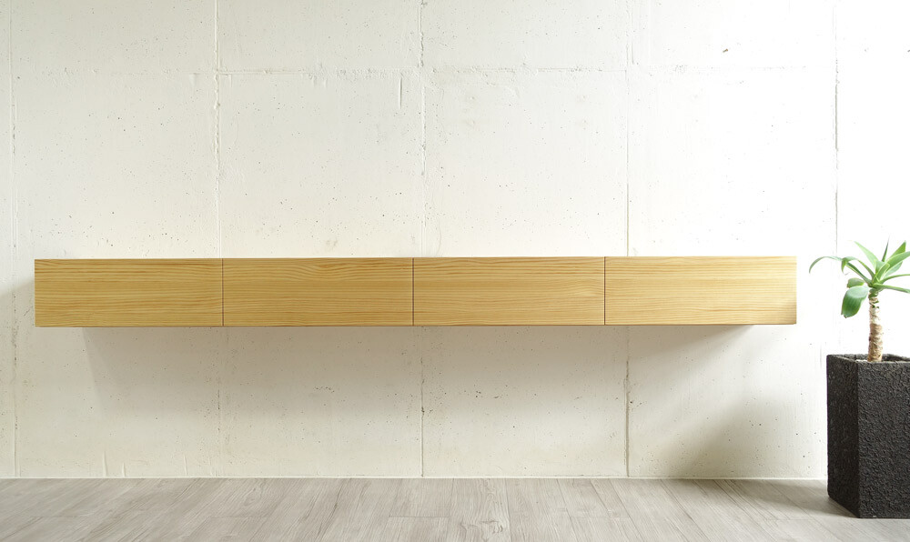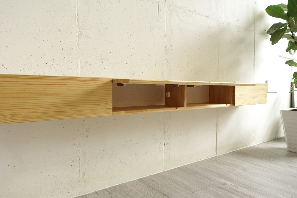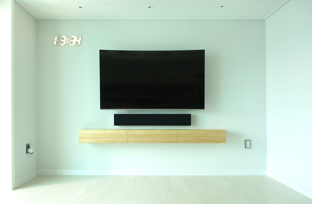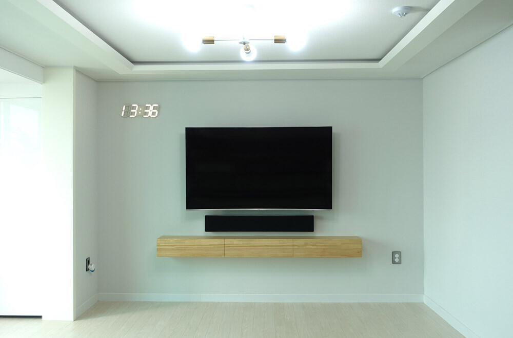 거실과 안방의 벽걸이TV 아래에 설치할 수 있는 무지주 형태의 거실장(선반장)입니다.