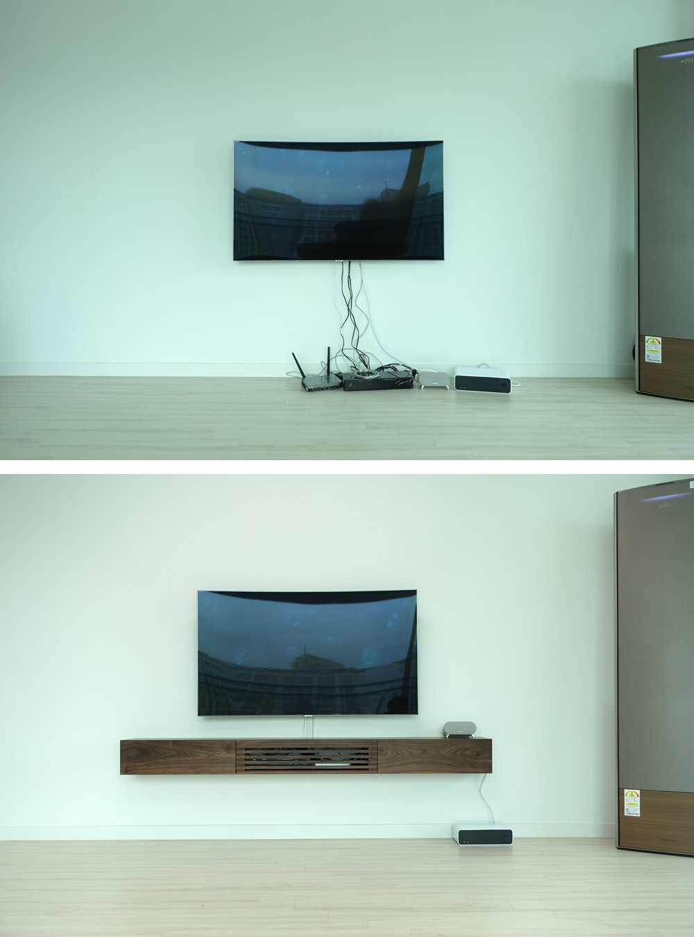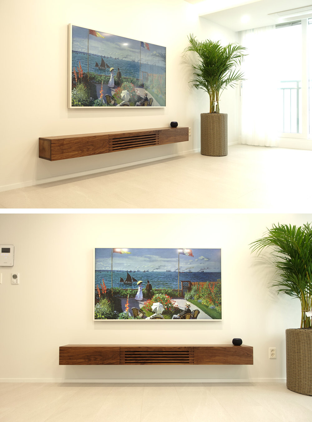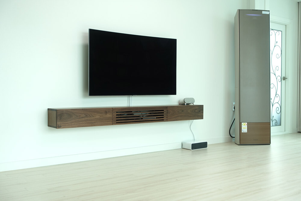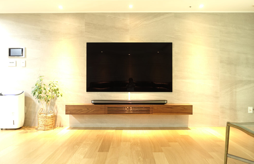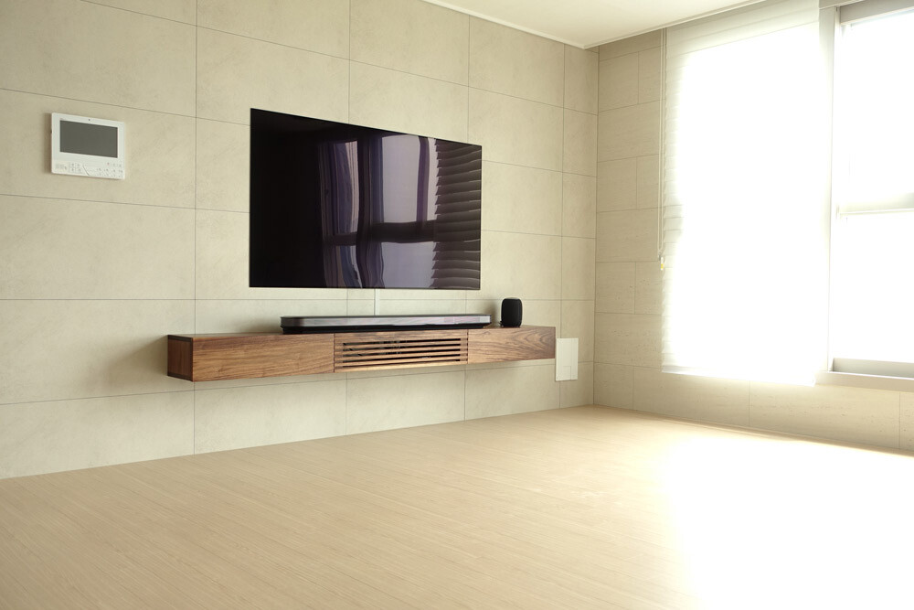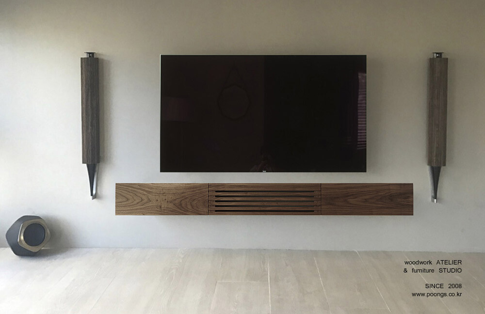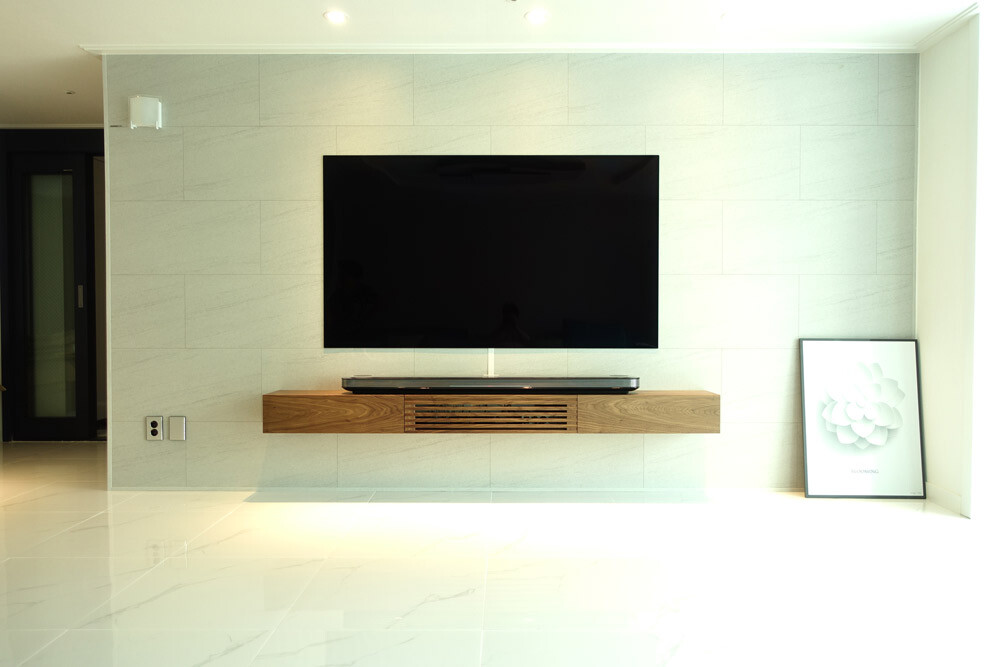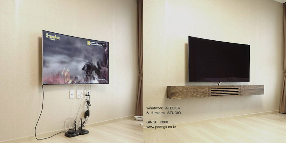 거실과 안방의 벽걸이TV 아래에 설치할 수 있는 무지주 형태의 거실장(선반장)입니다.