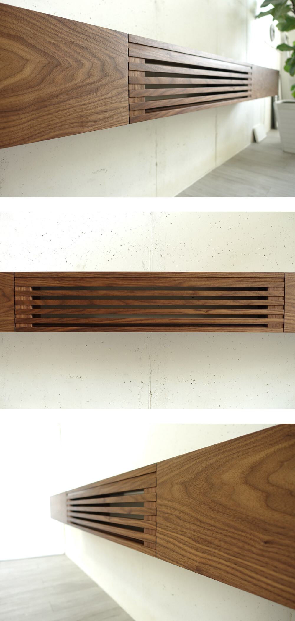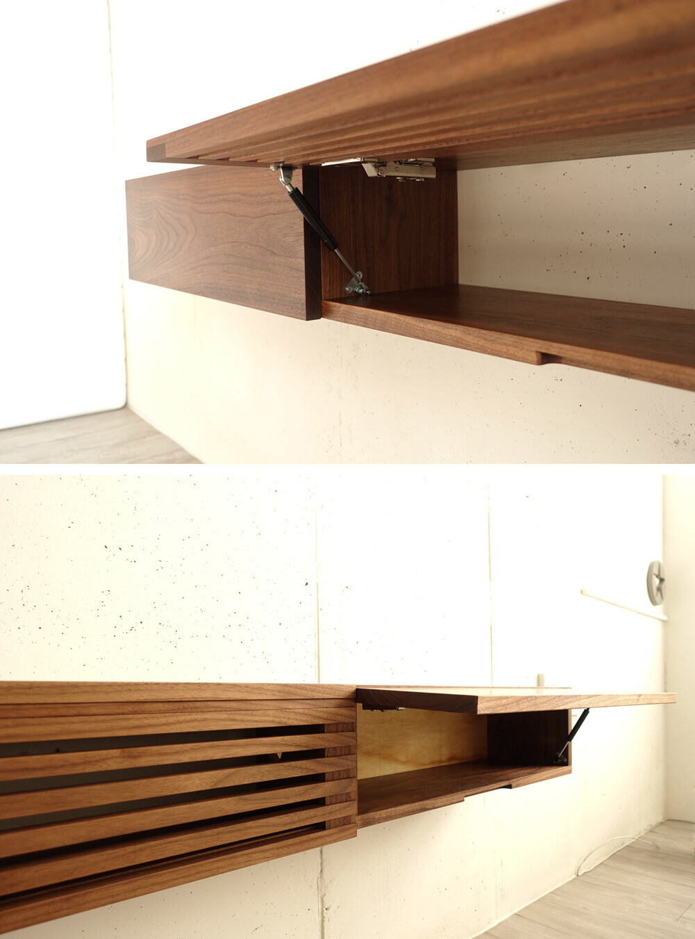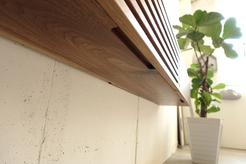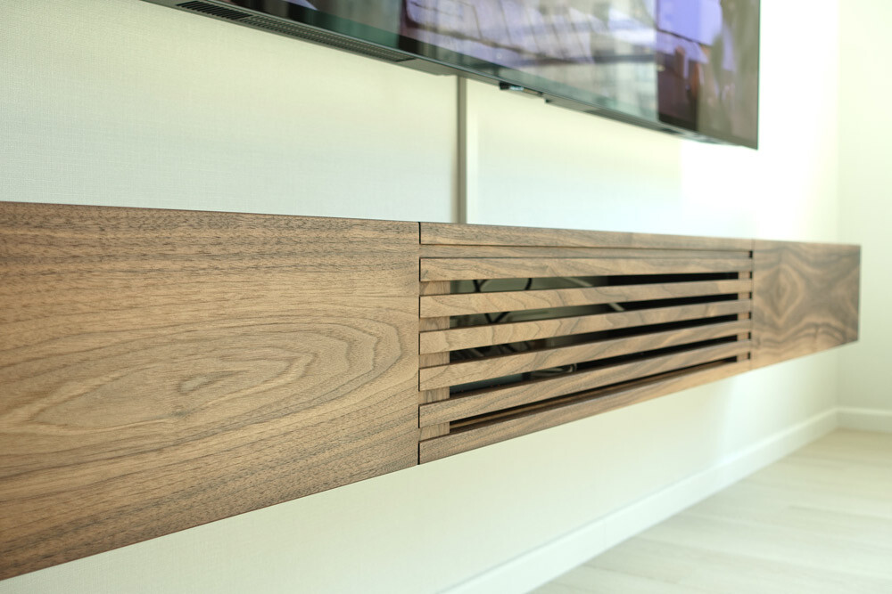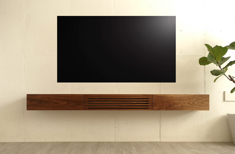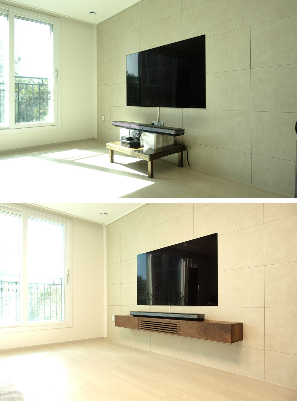 거실과 안방의 벽걸이TV 아래에 설치할 수 있는 무지주 형태의 거실장(선반장)입니다.