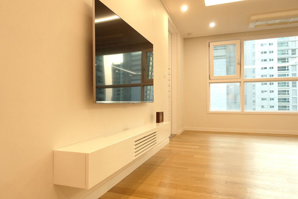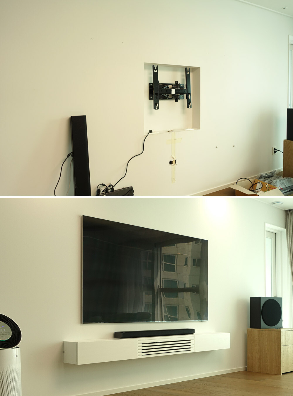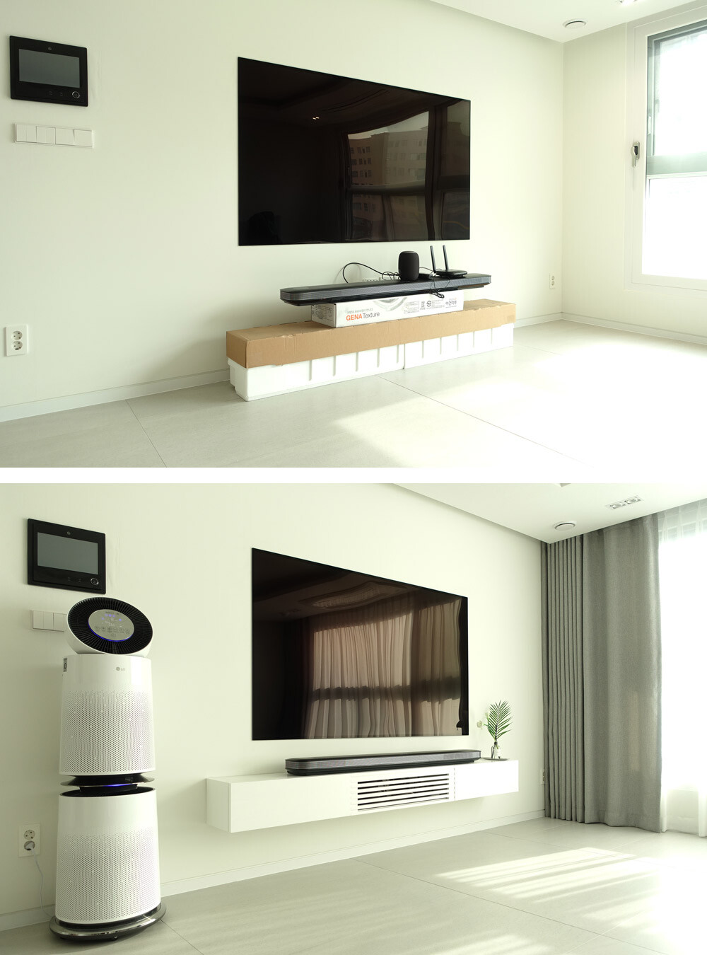 거실과 안방의 벽걸이TV 아래에 설치할 수 있는 무지주 형태의 거실장(선반장)입니다.