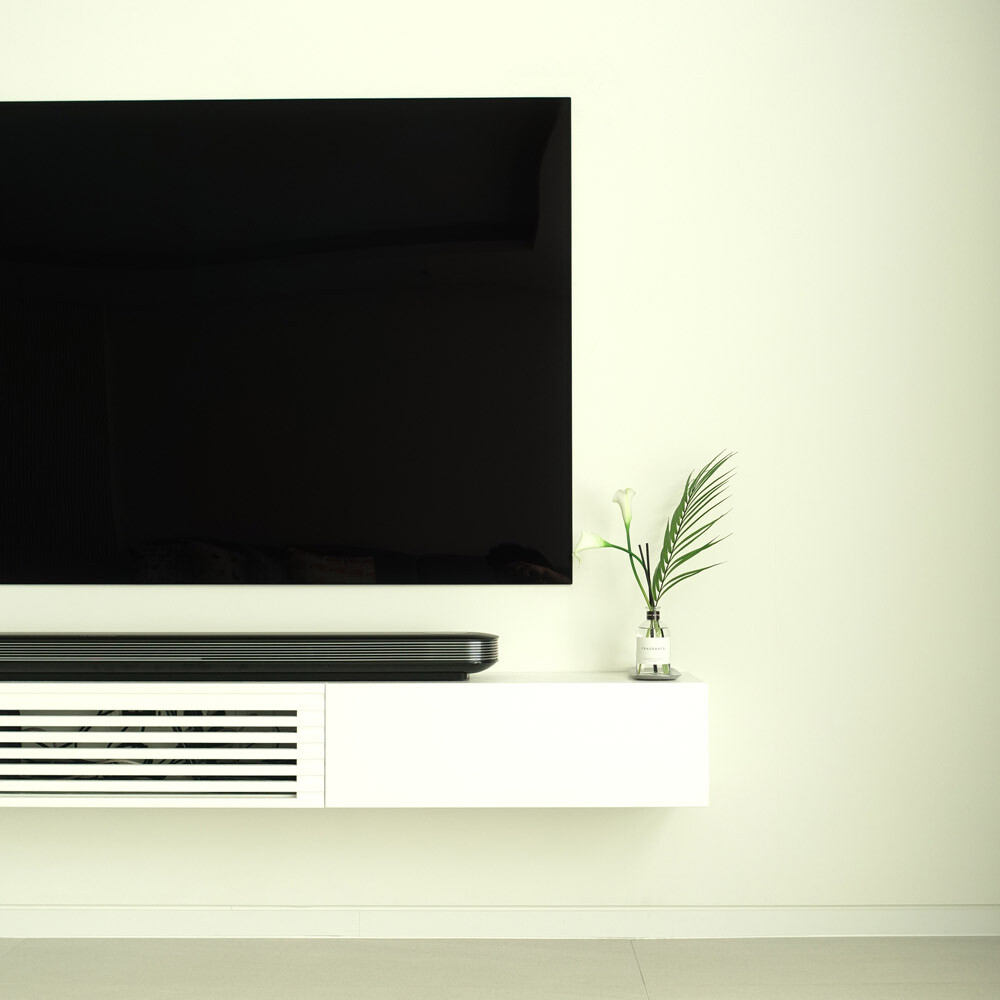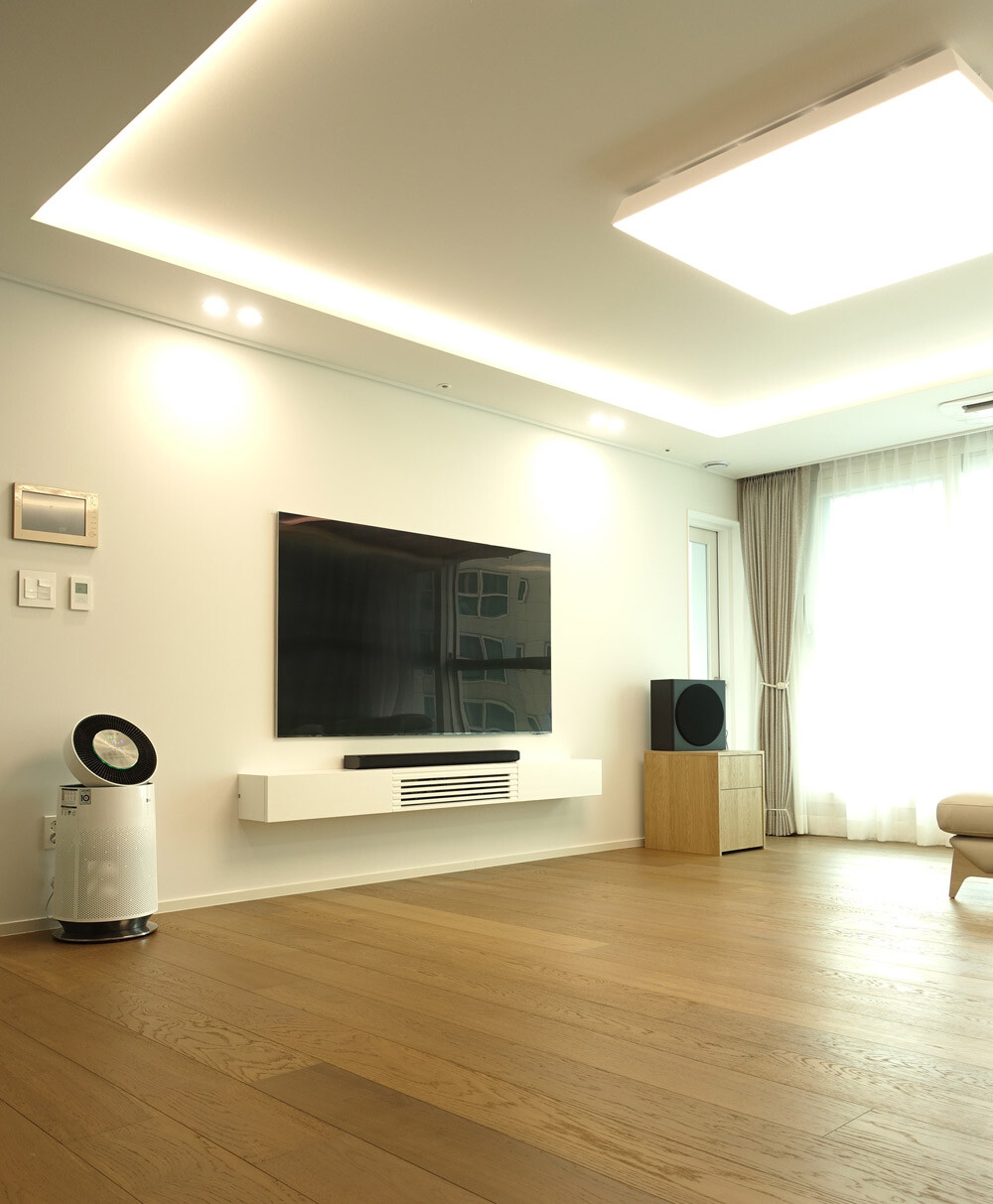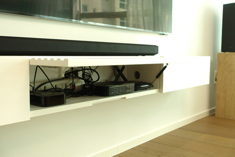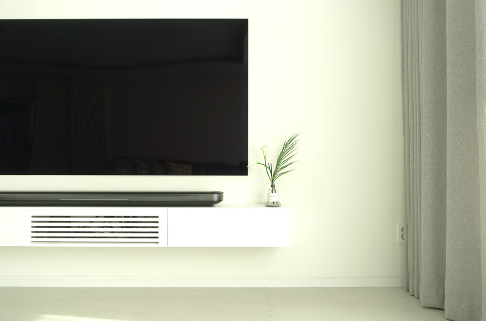 거실과 안방의 벽걸이TV 아래에 설치할 수 있는 무지주 형태의 거실장(선반장)입니다.